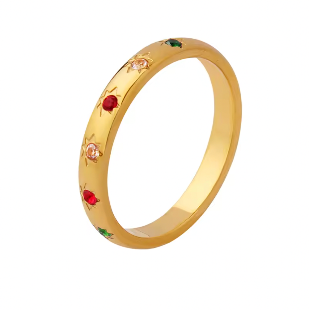 Anillo de acero inoxidable bañado en oro 18K con aplicaciones de circones de colores.